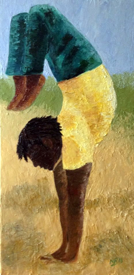 Nicole was inspired by The Africa Yoga Project and its mission to “educate, empower and elevate” young people in Kenya’s urban slums. Their website is lovely and inspirational. That’s where she spotted a photograph by Robin O’Neill and decided to paint the image. She reached out to the photographer, and, once permission and blessings were received, she just done went and gone and done it! I could try and tell you more, but trust me, Nicole’s enthusiasm and research are far more informative. (Please visit her auction page to get a dose of said information.) The fact that she’s putting this work out there to raise money for The Africa Yoga Project is, well, admirable.
