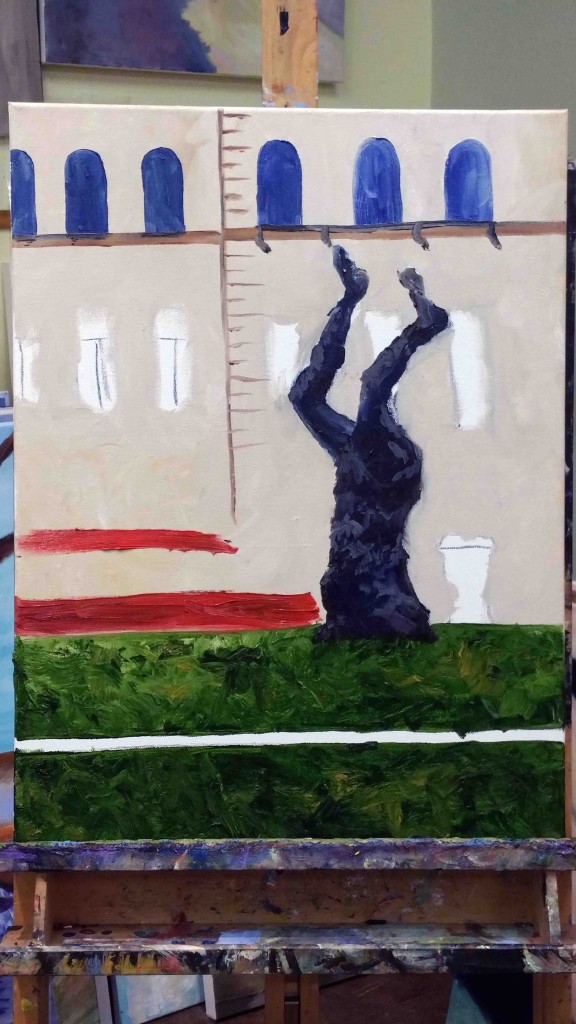 As you can see, a bit more was accomplished, but still not enough to convey my intentions. I mean, come on! Look at that “toilet” behind the upside-down dude! The building’s details were started, and that helped. But not enough. The third session saw great improvement…
