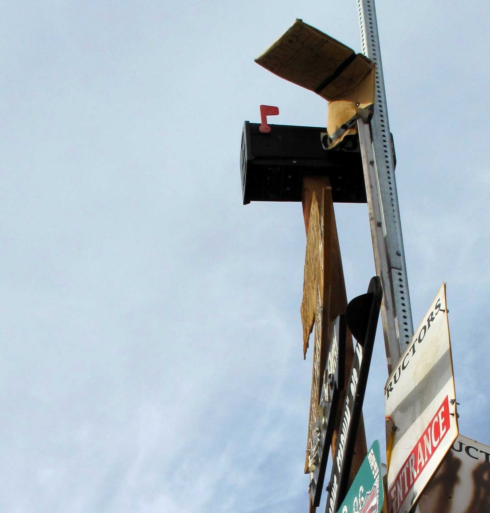 Anyhoo, as we drove along in search of the Message Fence, we spotted something else: a desert totem pole with Iron Mountain in the background. Filled with notes and mementos, it is a cool piece of art. My favorite bit of eye candy on this one is the mailbox at the top of the pole. The flag is up, waiting for attention.