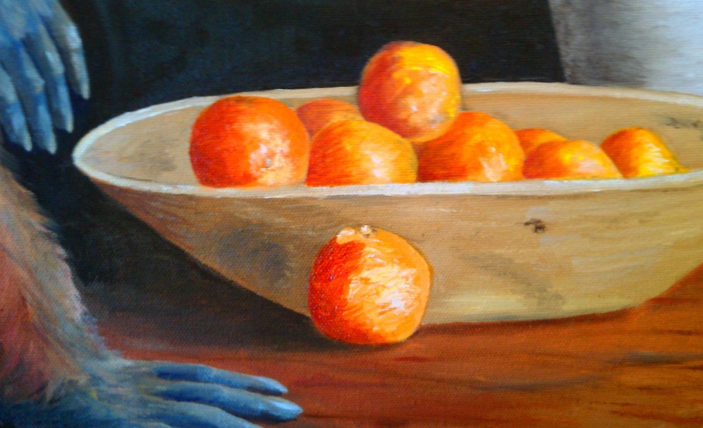 Anyhoo, as I went from photo to photo, I was commenting – aloud, thank-you-very-much – on what I liked about each painting. When I got to the above photo, I said, “Nice bowl of oranges.” Then I went on to the next phone-pic. Then I went back. I had failed to even notice that the bowl of oranges was a detail photo of one of my paintings.