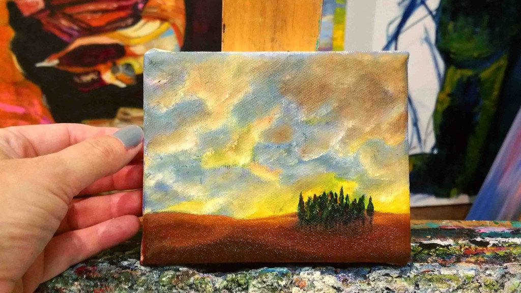 But I liked the idea of little paintings. And I wanted to give it a whirl. But I knew I don’t have the lady balls to go as tiny as Nicole’s paintings. So I got some 4 x 5-inch canvases and set off. What you see above is the first attempt. Not very exciting, granted, but a nice learning experience. We’ll see what happens when I get it in a fat frame. After all, a frame can make all the difference.