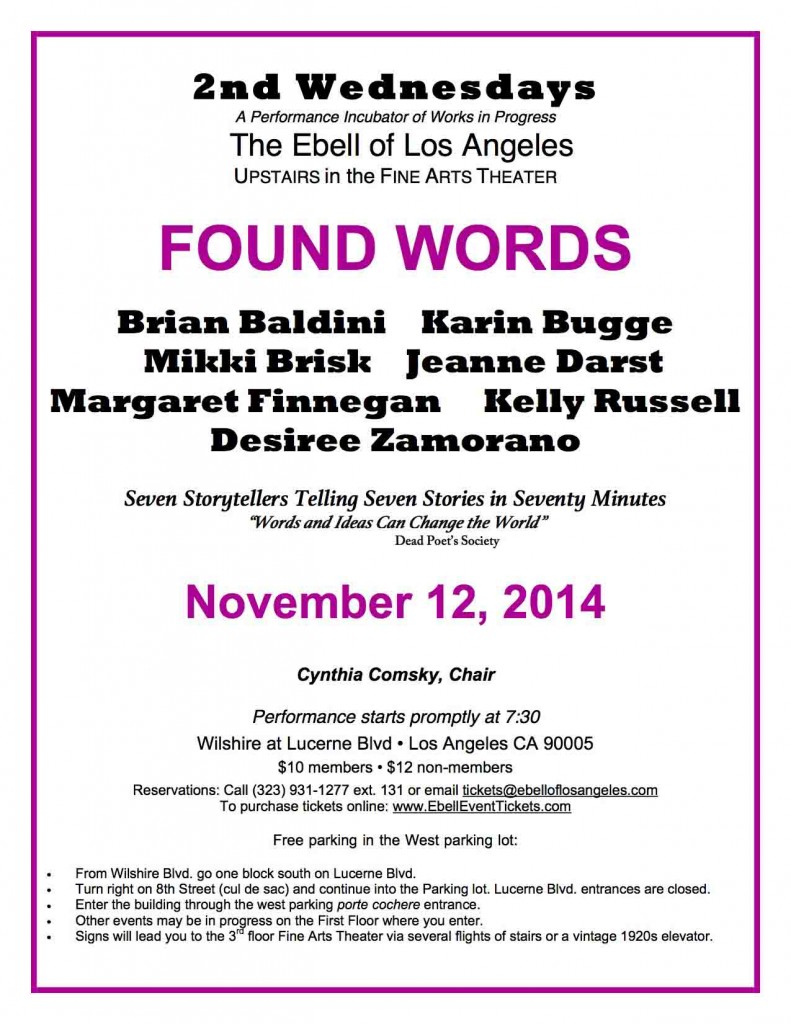 Tonight I will be appearing with 6 other writers at The Ebell of Los Angeles for an evening of storytelling. “Found Words” will feature Brian Baldini, Karin Bugge, Jeanne Darst, Margaret Finnegan, Kelly Russell, Desiree Zamorano and myself. We’ll be reading our own works and then meeting and greeting folks after the show.