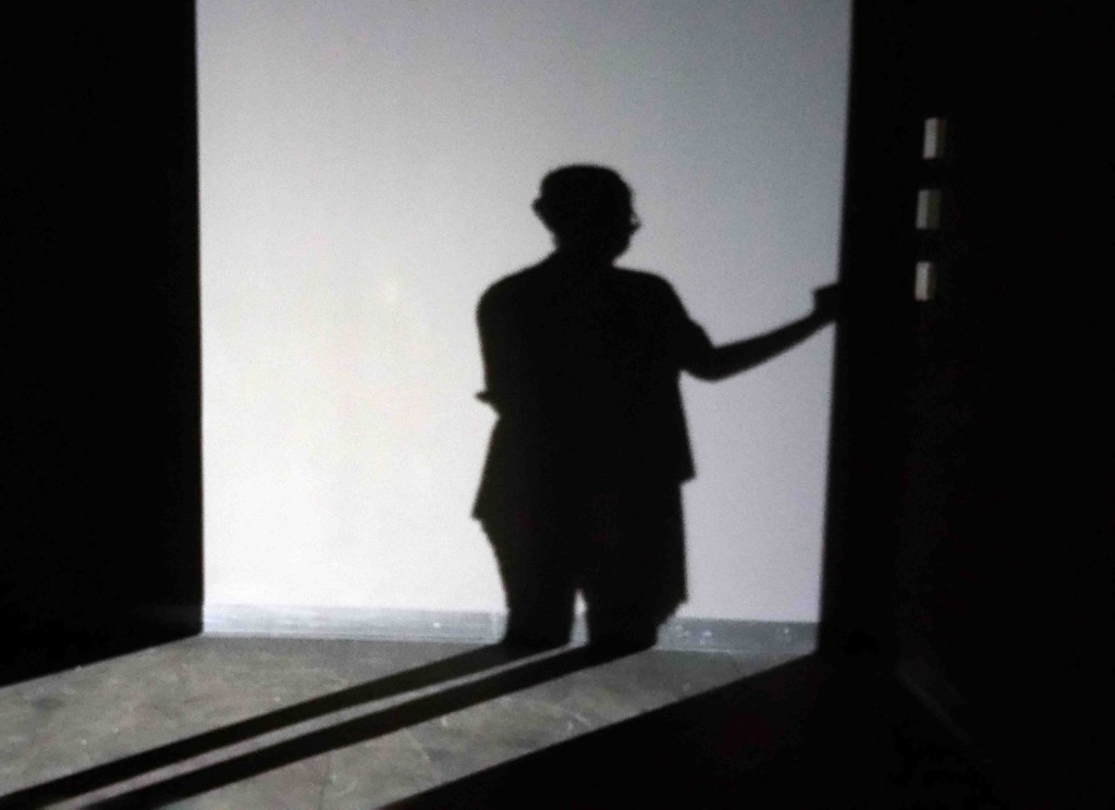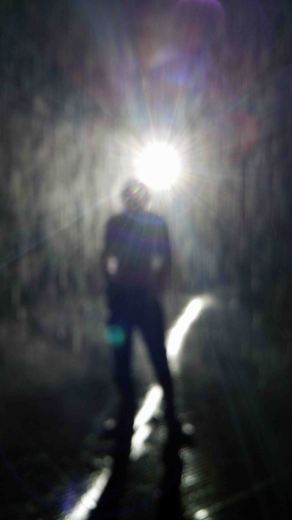 Upon arrival at LACMA, we were told the exhibit (Rain Room) was running a little late and that we could probably arrive at the entrance 10 minutes after our stated ticket time. So Mister and I decided to see the Mapplethorpe exhibit beforehand. (I had seen the photos already, but Mister had not. By the way, this exhibit is only on display through 31 July, so shake a tail feather and get yourself to Museum Row to see it!) Once we cruised through that, we made our way to the Rain Room entrance. We were only about 2 minutes behind our scheduled entry, but were told we were late! (Apparently, they had made up lost time since our arrival at the museum.) No worries, however, as we would be allowed entry with the next group in about 10 minutes. As we stood at the front of the queue, we started talking about how we had no idea what to expect. Rather suddenly, I found myself getting excited. The docent then began giving us instructions and pointers. We were told to move very slowly through the exhibit, as slow movement would interrupt the “rain” falling from the ceiling. We could expect to get a little wet, but not drenched. There would be a “dry” area all around the perimeter of the room. We were encouraged to take photos. And then we entered a long, dark hallway, where we were met by another docent. We could see a shaft of light coming from the main room and we could hear the sounds of falling water. And that was it. Once the second docent assessed the main room as being empty (of previous visitors), she allowed us entry.