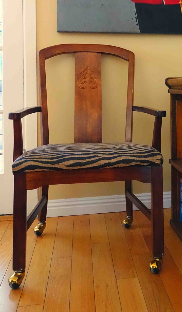 This is a dining room chair. I recovered the seat years and years ago, and I’ve loved that fabric since the day I found it. But like all good things, this fabric’s time had come and it needed to go away. There’s nothing wrong with it, mind you. It just doesn’t work in the new pad. And as I spend a great deal of time in that area of the house, I want the chairs to work and to visually appeal to me. (I have my priorities straight, don’t ya know.)