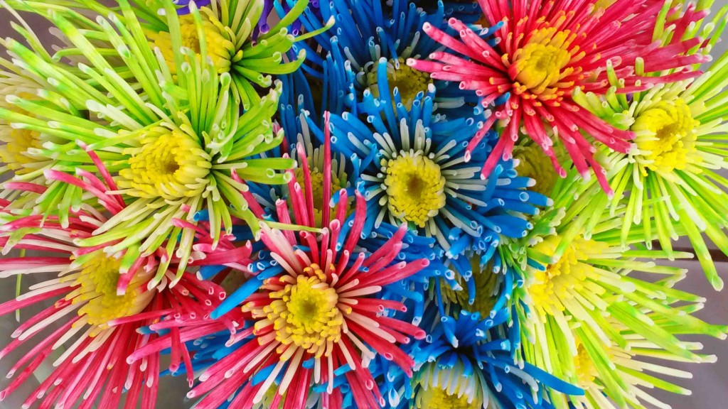 I spotted these flowers the other day and was mesmerized. Even though they were real, they looked fake. (Or maybe they were fake, but looked real. Hmm…) I didn’t buy them or anything. I just admired them, for their crazy, firework-y appeal. And regardless of the human manipulation involved (dye, dye, dye), they made me smile.