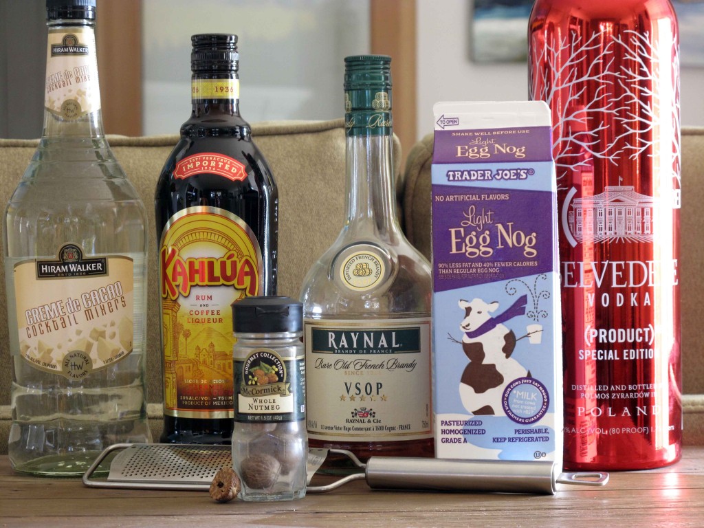 Store-bought Nog, Vodka, Kahlua, Creme de Cacao, Brandy, Nutmeg