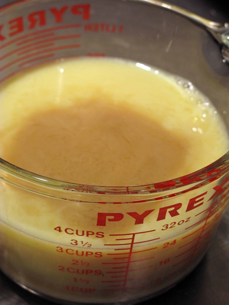 1. Combine all liquid ingredients in a large-capacity measuring cup (4-cups or more). This not only makes the measuring easier, it also makes the eggnog pourable once you’ve combined the liquids.