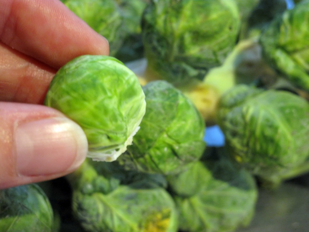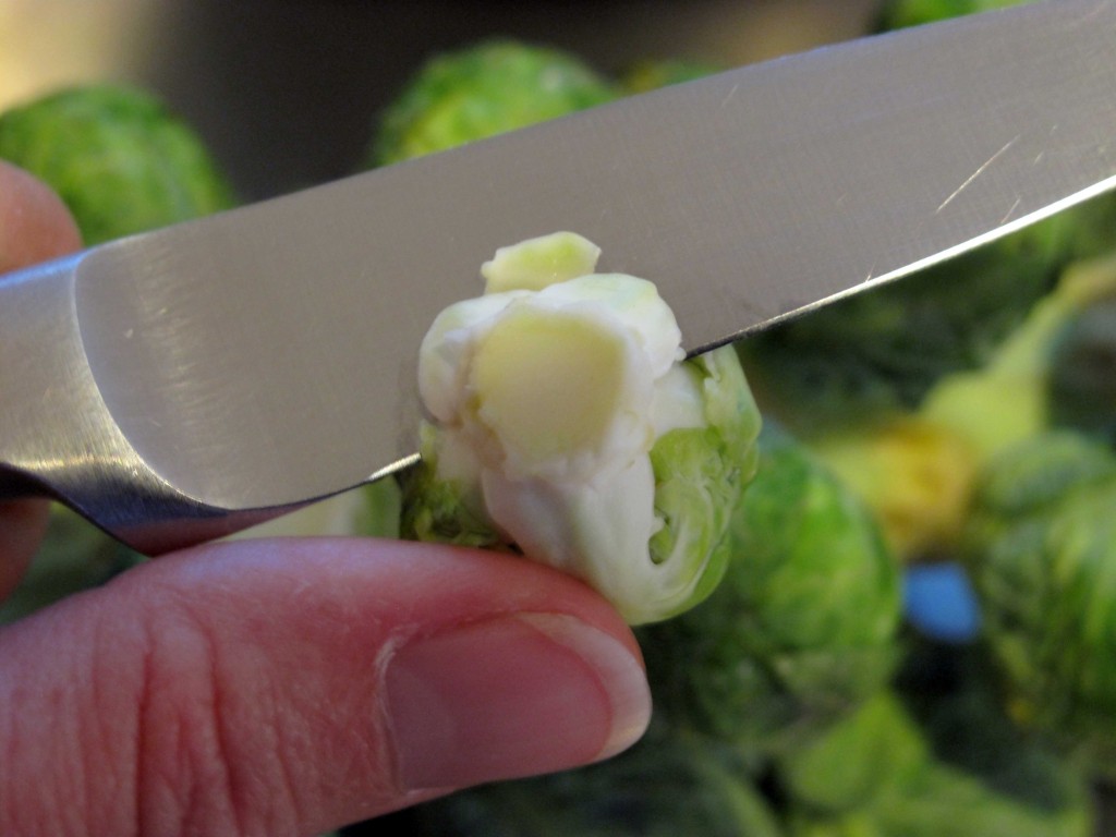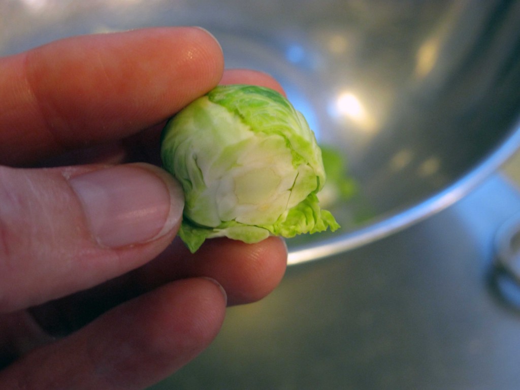 - Clean the Brussels Sprouts. If you’ve purchased a stalk of Sprouts, cut each Sprout from the stalk. Cut the thick bottoms from each Sprout. Peel the outer leaves away, revealing the lovely, green, inner leaves. Rinse and drain. Discard trimmed bottoms and outer leaves. (Note: In this case, 1 stalk yielded 4 cups of cleaned Sprouts.)