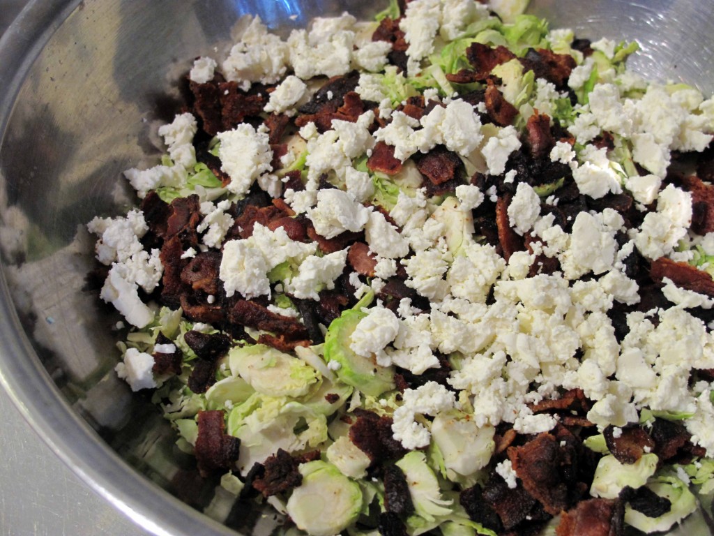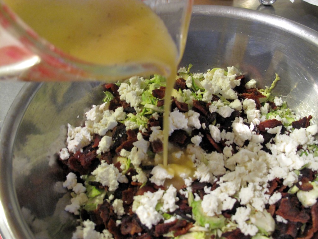 - Sprinkle the Crumbled Feta over the Sprouts and Bacon. Set the bowl aside while you make the Vinaigrette.