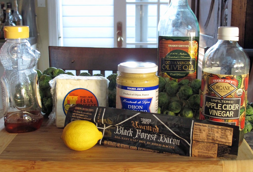 Raw Brussels Sprouts, Bacon, Feta Cheese, Olive Oil, Dijon Mustard, Apple Cider Vinegar, Honey, Lemon Zest & Juice, Salt and Pepper (not pictured)