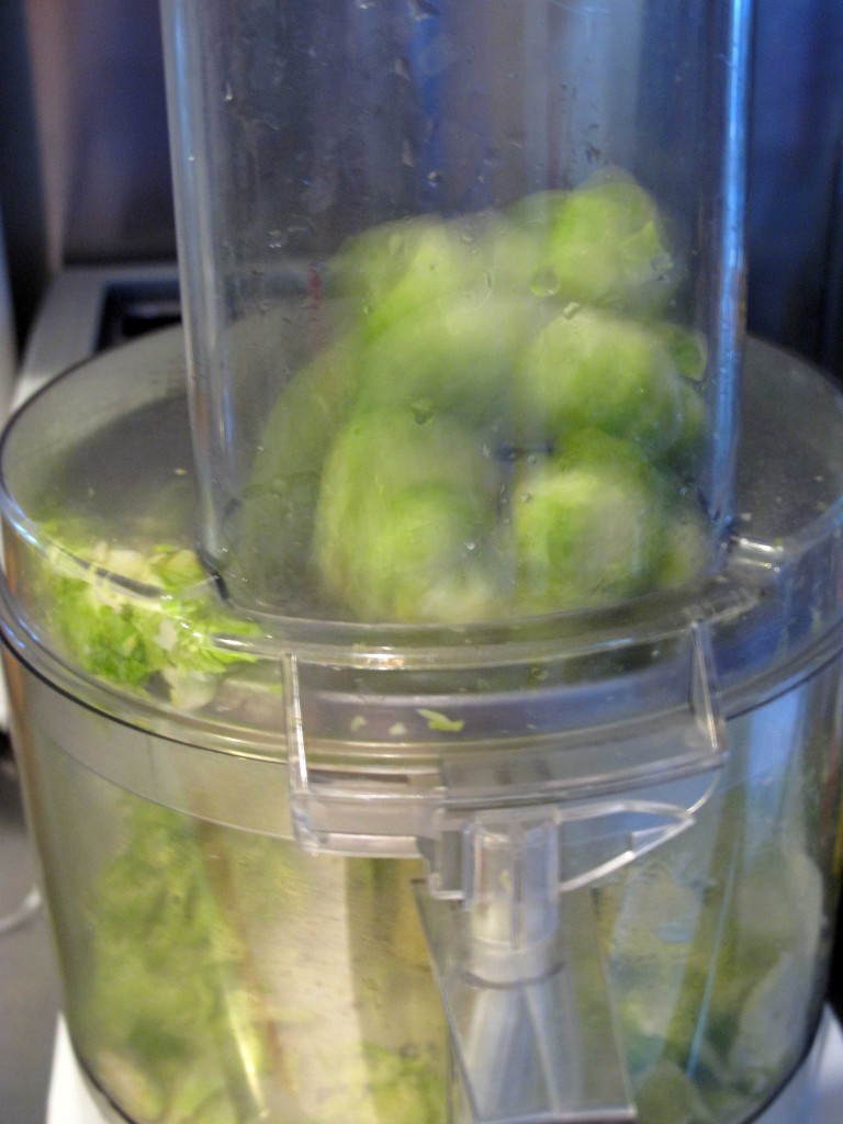 - With the slicer wheel in place, add the cleaned Sprouts to a food processor and cut them all. Alternatively, thinly slice each Sprout by hand. Place the shredded Sprouts in a large bowl and set aside.