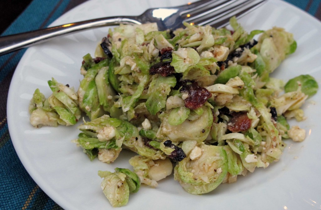One of my Rock Camp buddies made a beautiful and simple salad of raw Brussels Sprouts leaves and lemon vinaigrette last Christmas. It was an eye-opener. Raw Brussels Sprouts? I had no idea. But once I knew, there was no turning back. My mind began wandering. What else might be possible with the raw vegetable? This salad was the result of all that wandering and wondering. Here’s what you’ll need…