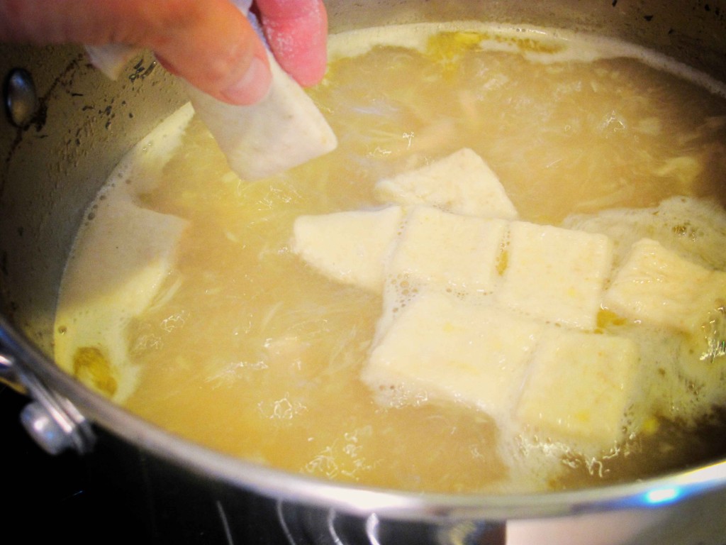 Cut the rolled dough into 1-inch-square pieces. I use a pizza cutter for this, and it’s grand. You can use a knife, too. Or a spatula, or whatever. But a pizza cutter rolls it just right for me, and it’s easy. By the way, you can also just tear the dumplings (instead of cutting) and go from there. Your call.