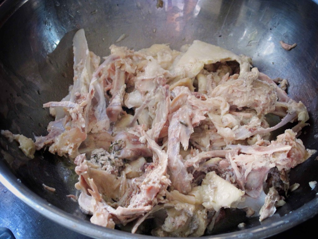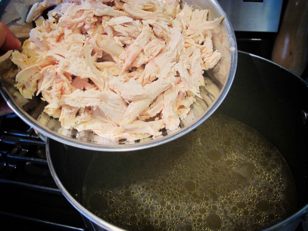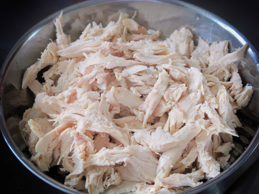 Now you have a whole, cooked chicken. You’re gonna want to skin and de-bone the bird, removing any excess fat in the process. Tear the chicken into bite-sized pieces.
