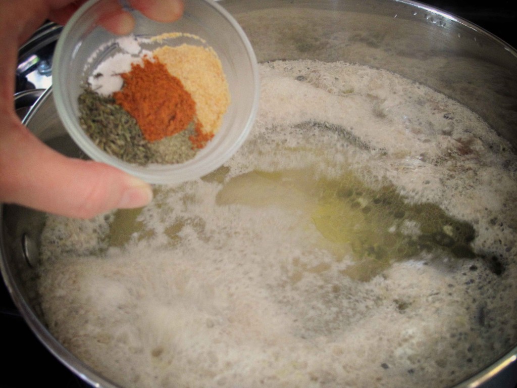 Bring to a boil, then add salt, black pepper, garlic powder, dried thyme and cayenne. Cover the pot, reduce the heat and simmer 1 hour. At this point, I let the whole she-bang cool and then place it in the fridge overnight. I do this because it makes it easier to skim the fat and scum from the cooked broth. And really, that extra fat is unnecessary. The scum is just grody, so yeah, I get that out of there, yo.