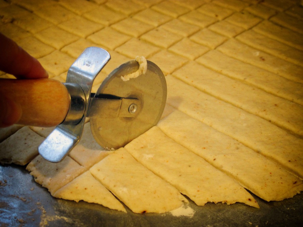 - Cut the rolled dough into 1-inch-square pieces. I use a pizza cutter for this, and it’s grand. You can use a knife, too. Or a spatula, or whatever. But a pizza cutter rolls it just right for me, and it’s easy. By the way, you can also just tear the dumplings (instead of cutting) and go from there. Your call.
