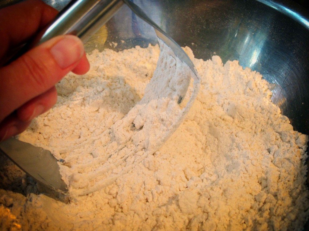 - Add the shortening and bacon drippings to the sifted flour mixture. Mix with a pastry blender (or two forks) until crumbly. I have never, ever gotten my flour-fat mixture to the point of appearing like “small peas.” It always just looks like flour to me, and it’s always fine. Don’t fret if a recipe describes an appearance you simply don’t achieve. It’s okay. I promise.