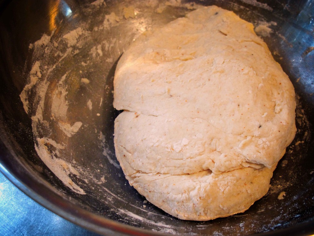 Add the shortening and bacon drippings to the sifted flour mixture. Mix with a pastry blender (or two forks) until crumbly. I have never, ever gotten my flour-fat mixture to the point of appearing like “small peas.” It always just looks like flour to me, and it’s always fine. Don’t fret if a recipe describes an appearance you simply don’t achieve. It’s okay. I promise.