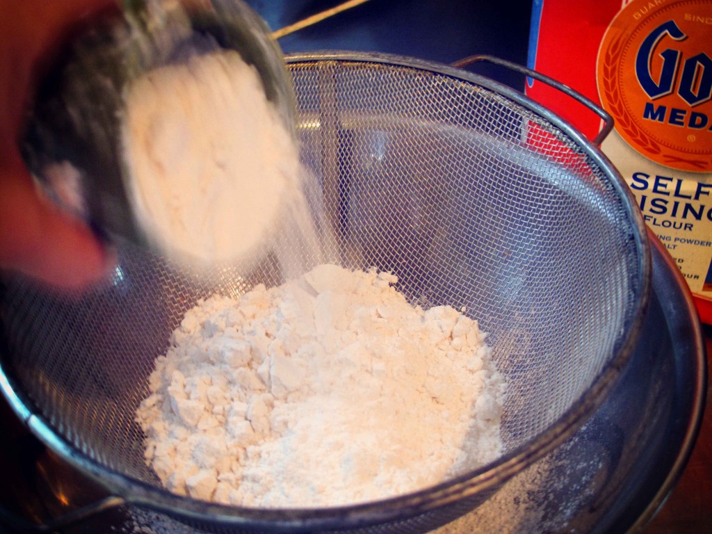- Now it’s time to make the dumplings, Dumpling! Add your measured self-rising flour to your sifter (or your strainer, if you’re like me).