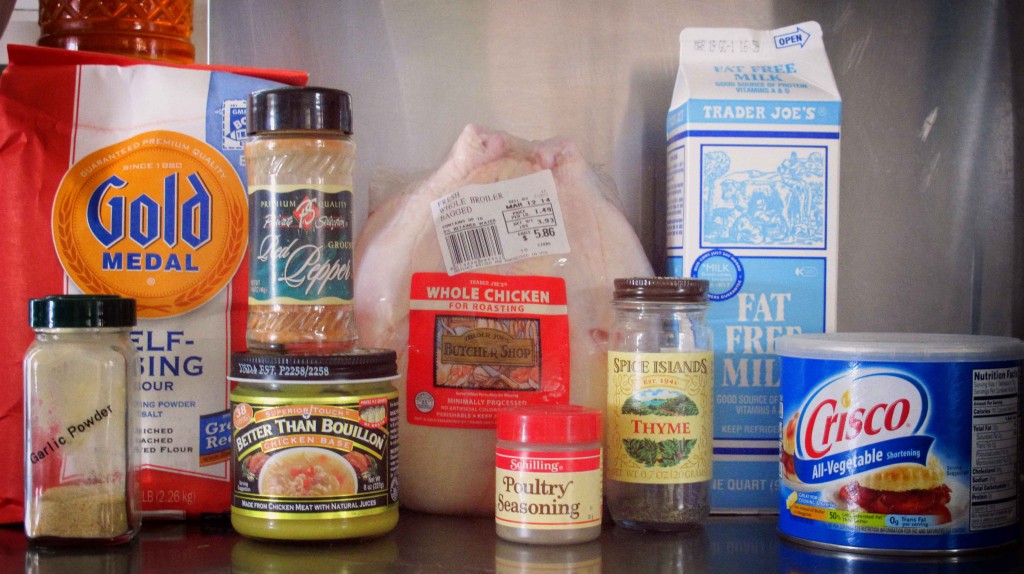 Whole Chicken, Garlic Powder, Dried Thyme, Cayenne Pepper, Chicken Broth Paste (or Granules), Self-Rising Flour, Vegetable Shortening, Dried Poultry Seasoning, Milk and (not shown) Salt, Black Pepper and Bacon Drippings