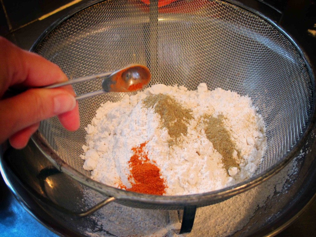 - Add the poultry seasoning and 1/4 t. cayenne pepper to the flour, then sift into a bowl large enough to hold the ingredients.