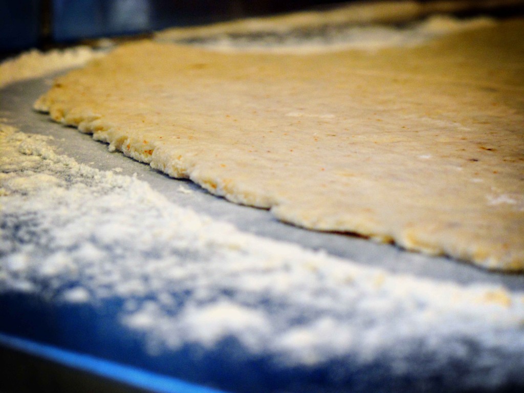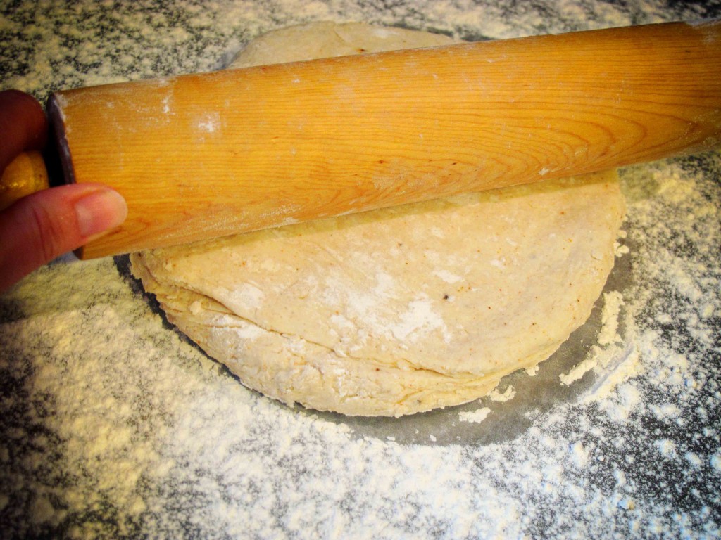 On a lightly floured surface, turn out the dough. Flour your rolling pin a bit (or your glass or bottle or whatever the heck you use to roll dough), then roll to 1/8-inch thickness.