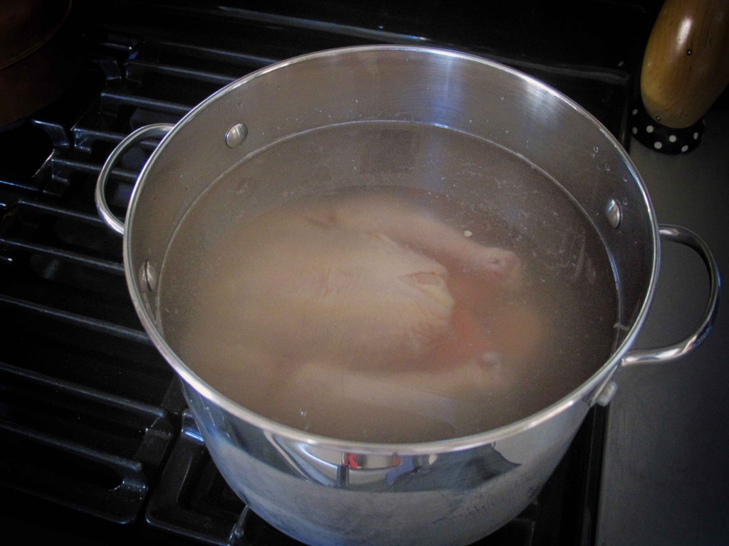 Add the beautiful chicken to the simmering broth, then add the remaining salt, pepper and bouillon paste/granules to the broth. Return to a simmer.