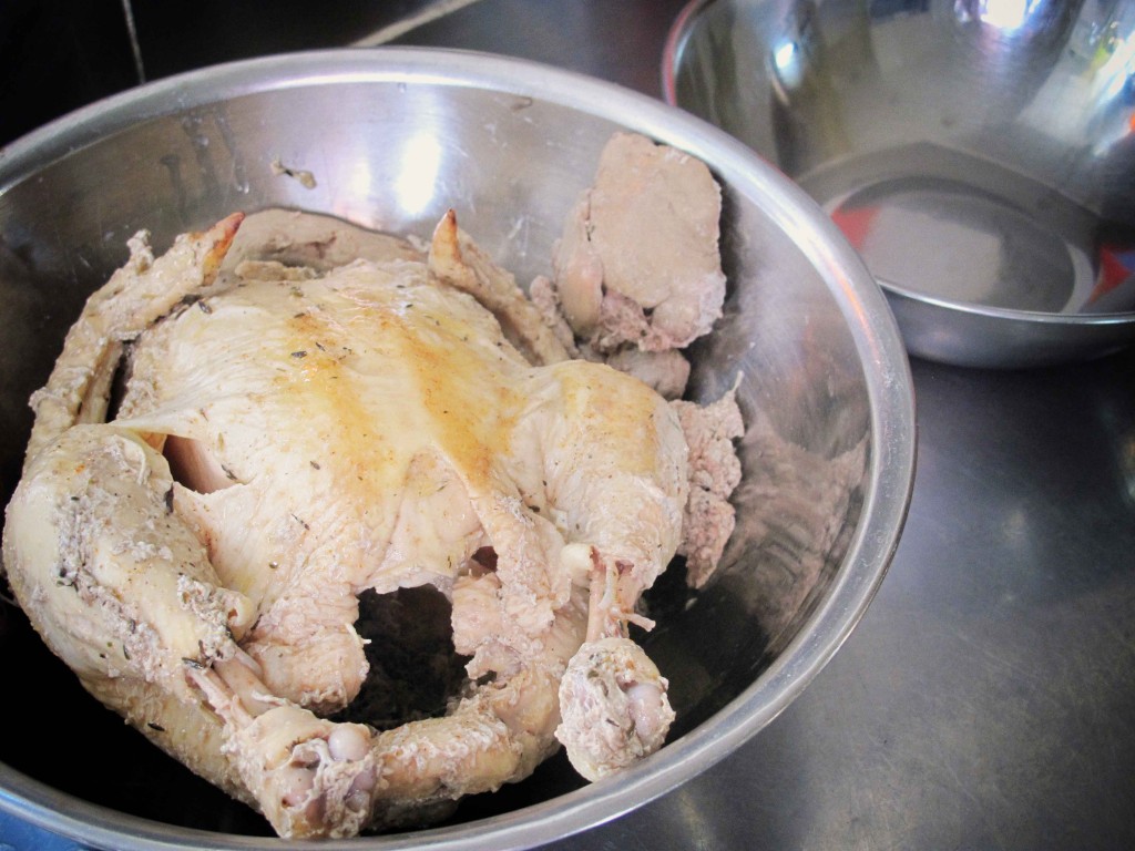 You’ll also have an ugly bowl of chicken skin, bones and fat. You’ll want to get rid of this as soon as possible, as it’s unseemly.