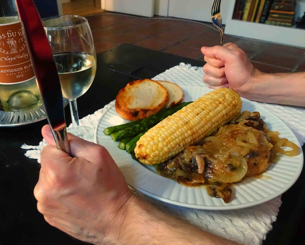 Friday night we had an amazing Caesar Salad with Roasted Salmon. It was so good, I suggested we eat that mutha once a week. Saturday morning, we had a tomato-fontina tart with an avocado and hard-cooked-egg salad. Lunch wasn’t much to speak of, but dinner was out and fab: fried calamari, antipasto salad and pizza. Sunday’s breakfast was of the ordinary, fend-for-yourself variety. Lunch was a Caprese salad with home-grown tomatoes and bacon. Dinner was chicken braised with mushroom gravy, grilled corn and grilled asparagus. Put it all together and that, friends, was a whole lot of good eatin’.