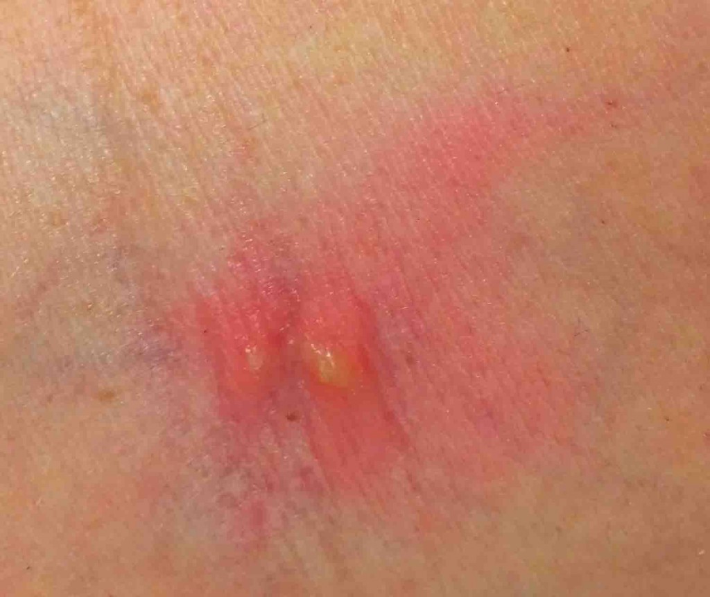 By Monday morning – less than 36 hours since the assault – the bites were more pronounced and the red area on my arm had grown. The welts were actually hard, too. And the itching wasn’t getting any better, either. So I called my doctor’s office, thinking maybe I could simply send a photo and they could tell me whether or not I needed to go in. The phone call was rather brief, as I was told to get thee to urgent care. And by thee, I mean me. And by urgent care, I mean urgent care. Easy words like “infection” and “discoloration” were tossed about. Not so easy words like “cellulitis” and “necrosis” were spoken, too, and I didn’t much like the sound of those. Reluctantly, I did as I was told and by the time I got in to see the doc at urgent care, the red area had sprouted a few veiny legs and was getting bigger.