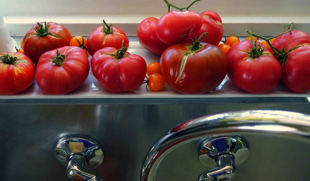 We have a bounty of home-grown tomatoes on the sill and I am a smitten kitten.