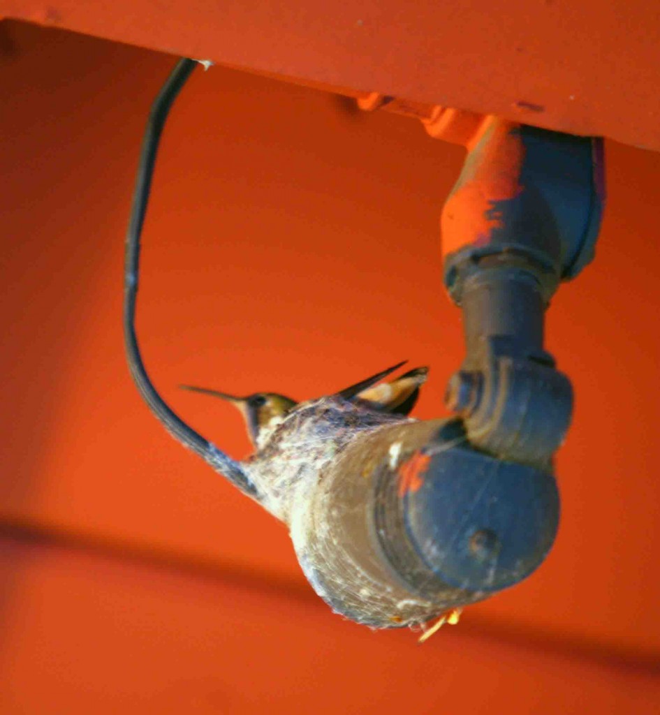 Oh well. We still don’t mind her being there. And I’m kind of excited to see itty-bitty baby hummingbird heads popping out of that itty-bitty nest. Nature is a hoot.