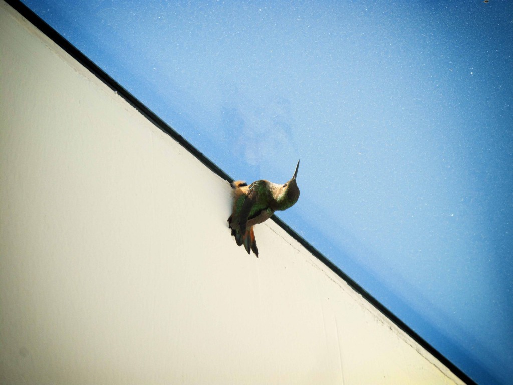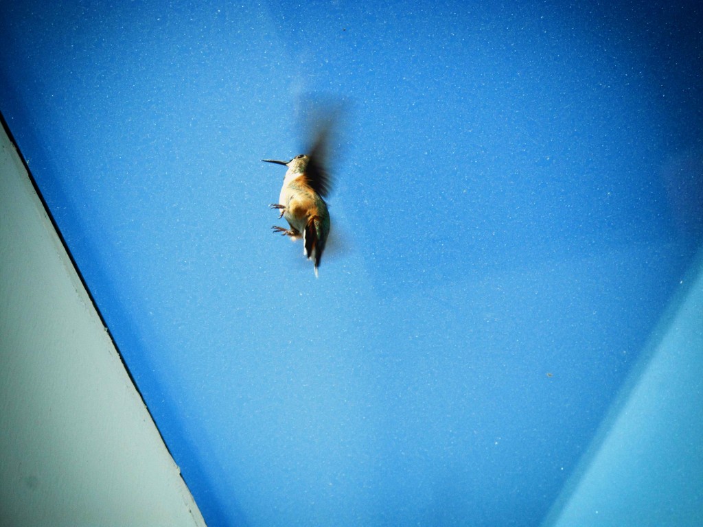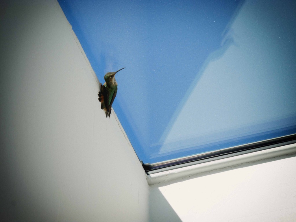 A few minutes later (and only a few), Mister and I realized the sound wasn’t lessening and we both headed into the rumpus room to investigate. That’s when we saw it. A hummingbird had flown into the house and was trying to escape through a sky light.