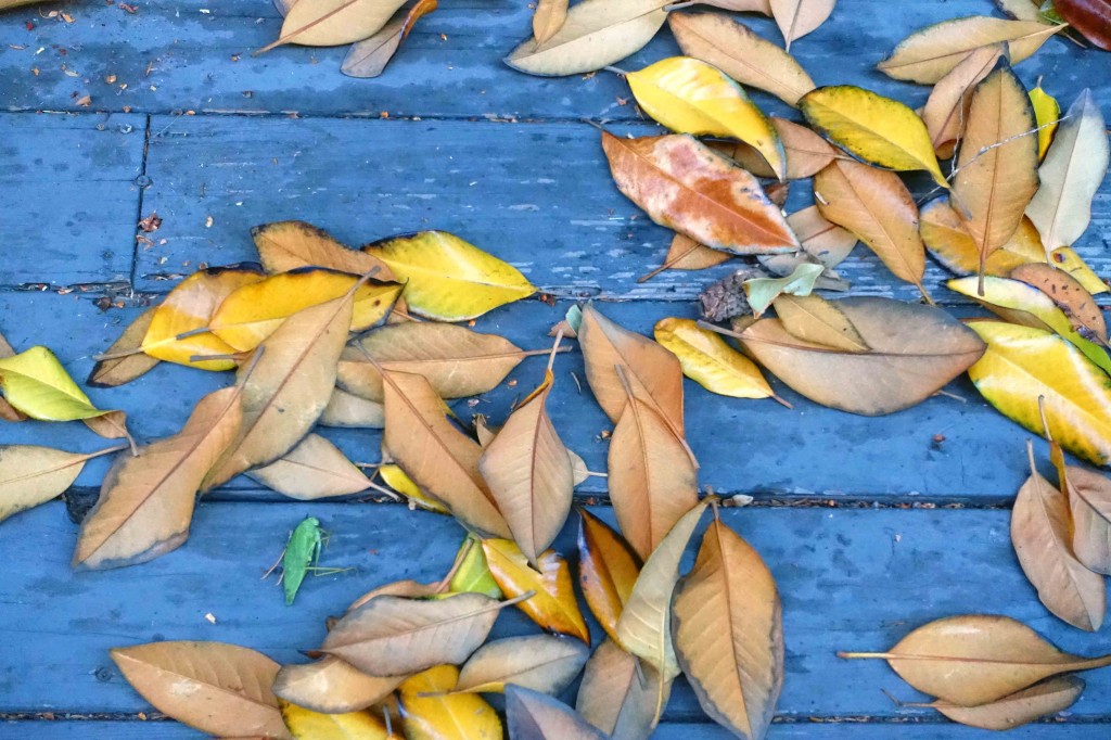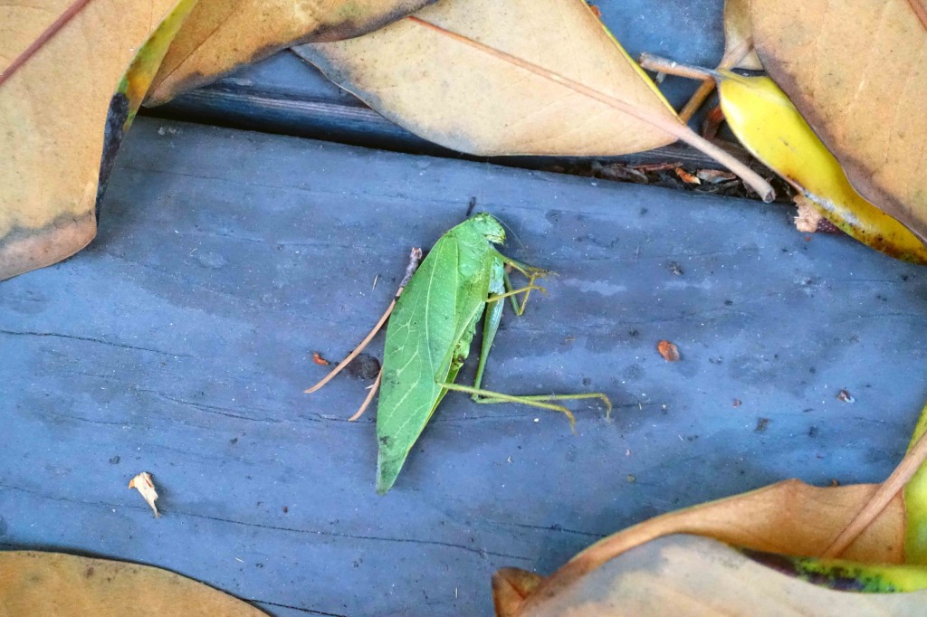 Yesterday morning I looked out at the deck and the rain had indeed tripled the downed leaves. As I swept the yellows and browns into a pile, I noticed a single green leaf amongst the fallen. The katydid had not survived the night.
