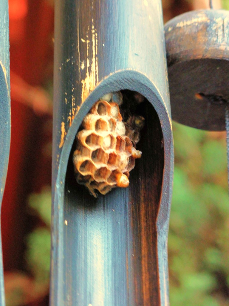 After a couple of minutes, we went back outside and I heard Mister doing his best mob impression, “You mess with me, I mess with your entire family!” Then, before I knew it, that guy had blasted bug spray and killed every single wasp in the wind chimes. Bye-bye wasps.
