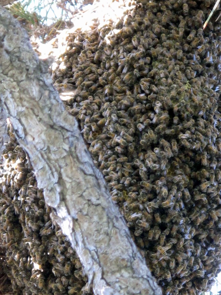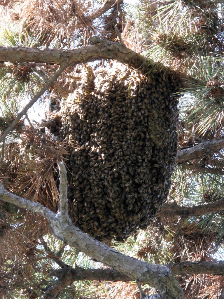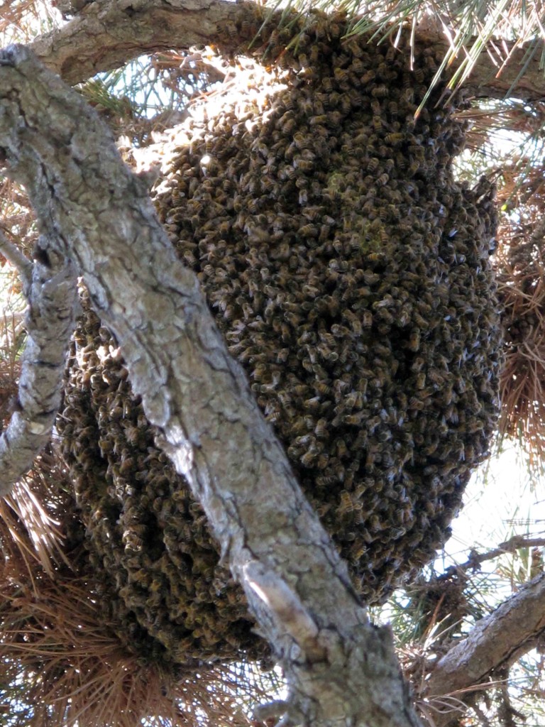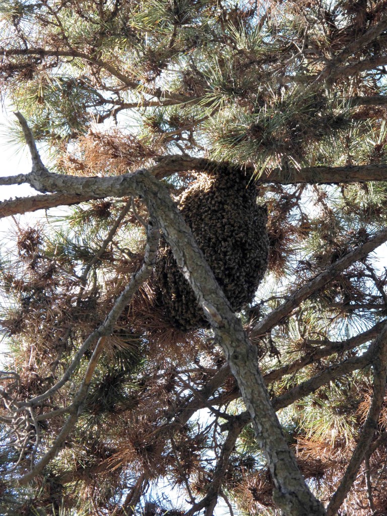 Recently I was walking around and doing my best to look up in this world. As I took a break, I was thinking about an old pine tree whose shade was shielding me from 100+ degree heat. As I stood there, ruminating on that tree’s health, I noticed something was a bit out of the ordinary. Way up in that pine tree was a honey bee nest at least 2 feet tall and 1 foot wide, covered in about a million, billion, godzillion bees.
