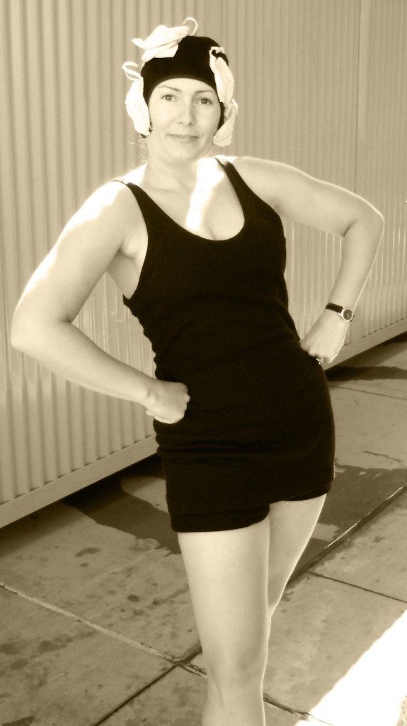Years later, I was asked to appear in an episode of “California’s Gold.” This time the focus was on the bathing suit industry and its California history. I brought my cousin Shady along, and we rode to Huntington Beach with my friend Cheyenne and her kids. We all arrived and changed into the vintage suits provided and posed on the beach. I was wearing a 1920’s one-piece (the real deal, folks) and just before I headed out, the stylist said I should be wearing a bathing cap. She had me twist my hair up on top of my head and then she swiftly wedged the cap onto my noggin. I never got to see it and had absolutely no idea how I looked. I went out to the beach, Huell got the shot and then I waited a while, in case anything else was needed. While I stood, people kept coming by and pointing and smiling. I was with a few others, all in period swimmies, so I didn’t think anything of it. When we were finally told the shoot was finished, I turned to head back to the changing area. That’s when I saw my shadow. There were all sorts of strange little doo-dads springing forth from my head. What the heck was on that swim cap? When I removed it, I was able to see: little bird-like shapes were stuck all over the danged thang. I was a total dork. It didn’t matter though (as I’m used to being a total dork), and after the shoot Huell took us all to lunch. It was a really nice day by the sea.