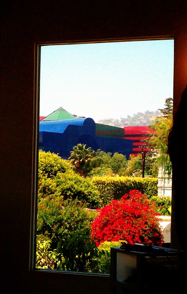Anyhoo, as I sat getting my do done yesterday afternoon, I looked into the mirror before me and dreamily gazed upon the above reflection. That’s the Pacific Design Center looming large and to the left. In the distance, to the right, are the Hollywood Hills.