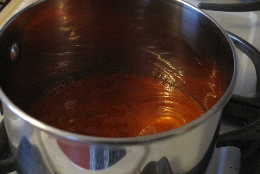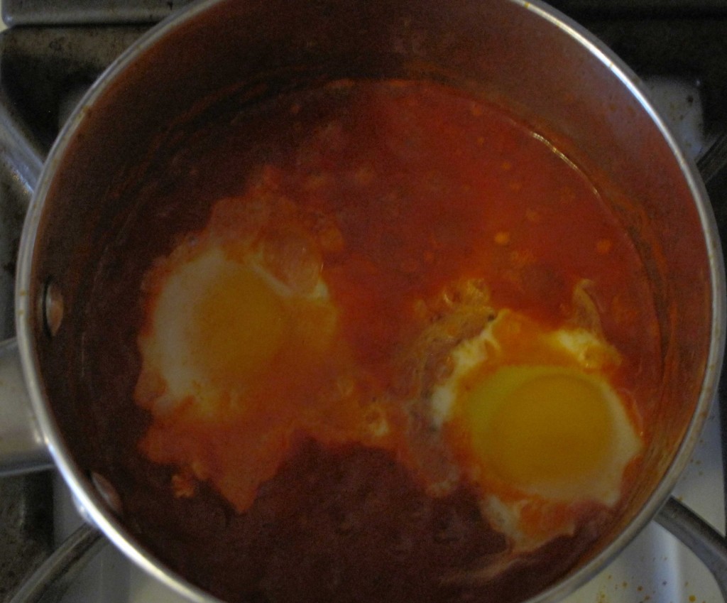 Crack each egg (separately) into a small dish, then slip into the simmering marinara. Be sure to give each egg enough room to cook. Replace lid and cook on low heat (simmer).