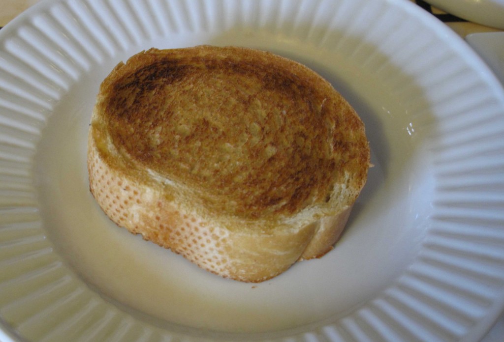 While the marinara heats, cut the bread into 1-inch slices and toast. You may, of course, use any bread you like (or have on hand). I like French bread because it retains some softness after toasting.