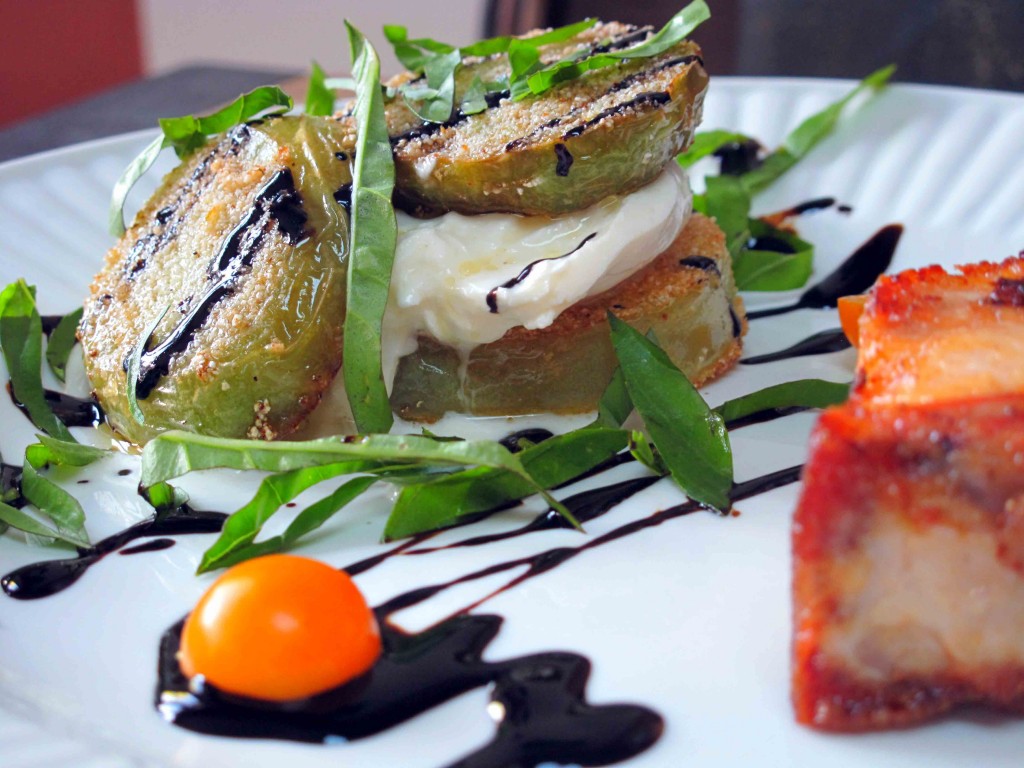 Prepare each stack. Place a slice of cheese – along with some of the inner Burrata cream – on one fried tomato slice, then top the cheese with another fried tomato slice. Repeat until all tomatoes are stacked. (Your “stacks” may be as many as 3 or 4 tomatoes high – it’s up to you.)
