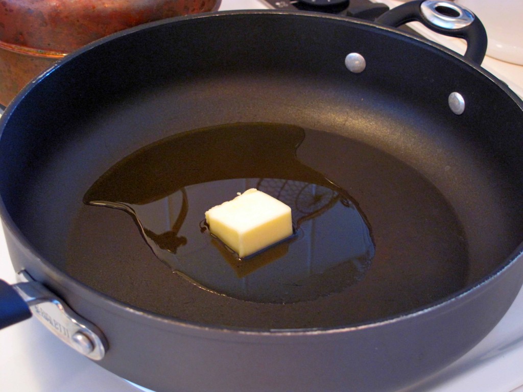 When all the tomato slices are coated, place the olive oil and butter in a large, heavy-bottomed skillet over medium-high heat.