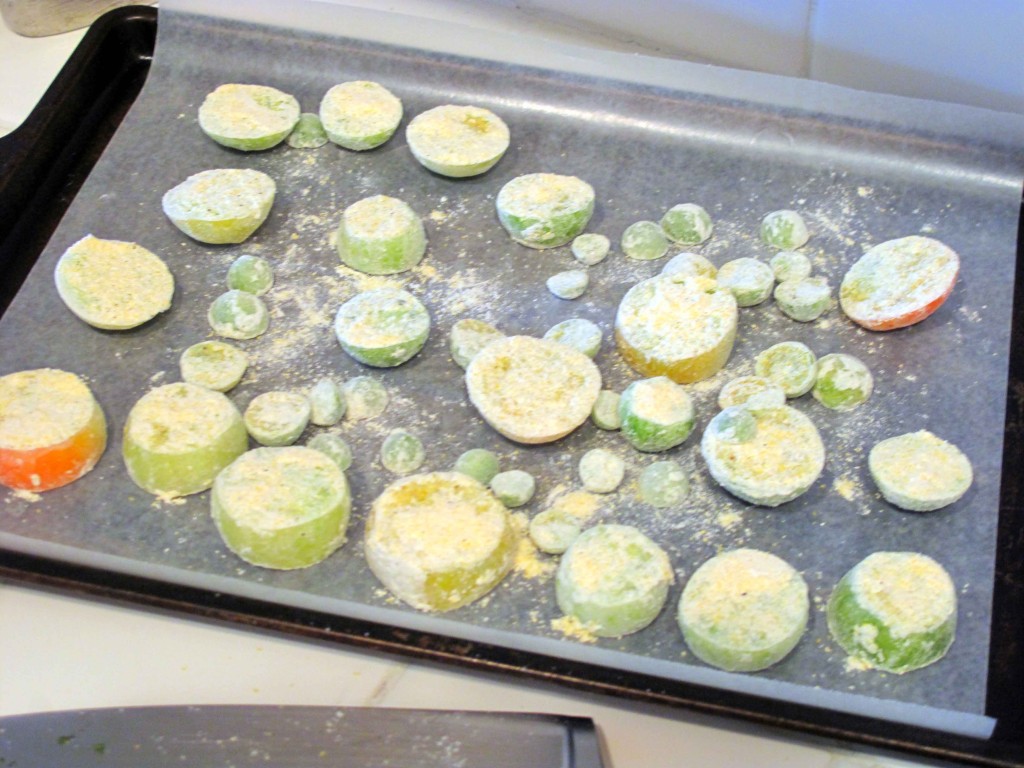 While the balsamic is reducing, cut the green tomatoes into fairly thick slices, about 1/3 to 1/2 inch. Set aside. On this point, please, please, please use green tomatoes. I have learned this through trial and culinary tribulation, y’all. If those to-mates are already turning, just let them be. You want green and firm for this recipe.