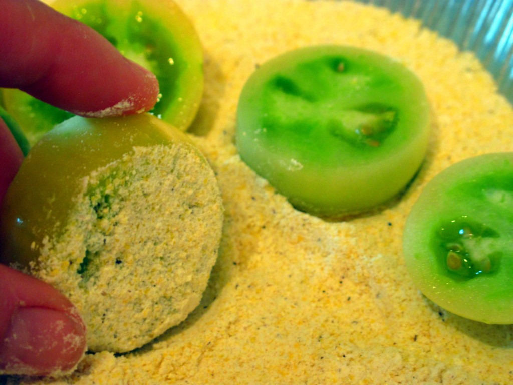 Dredge each tomato slice in the corn meal mixture, being sure to really coat well.