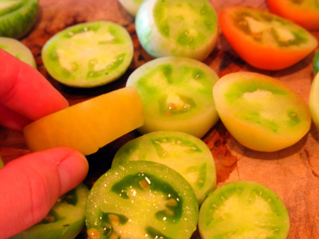 Now, I’m not gonna lie, y’all. I kludged together photos from multiple cooking sessions. The photo immediately above shows full-sized green tomatoes and that is what you want! Don’t try to make the dish with little green tomatoes (as shown in the main ingredients photo). It will drive you crazy! Go full-sized. Trust me.