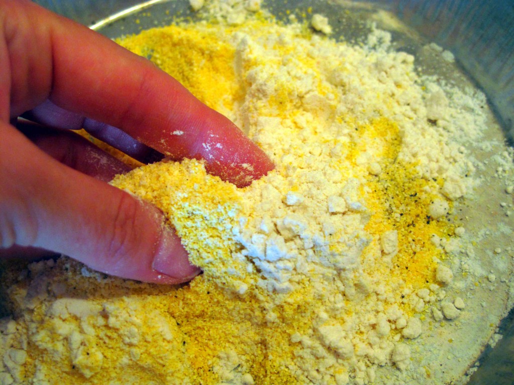 - In a shallow pan or plate, combine the corn meal, flour, sugar, salt, pepper, cayenne and smoked paprika.