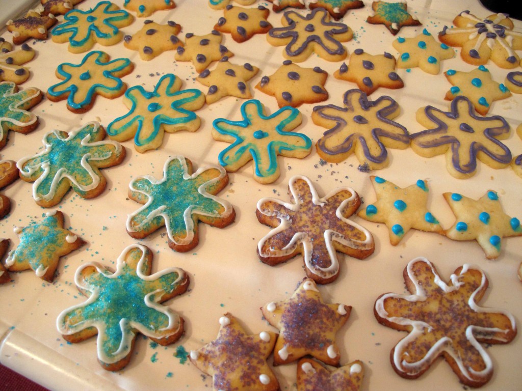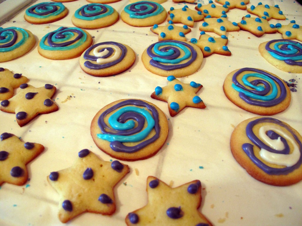 Apply the dyed icing to the cooled cookies in any designs you want! I made this batch for a Hanukkah party. But think about it – you could decorate these cookies for Halloween, the 4th of July, Talk Like a Pirate Day, whatever!