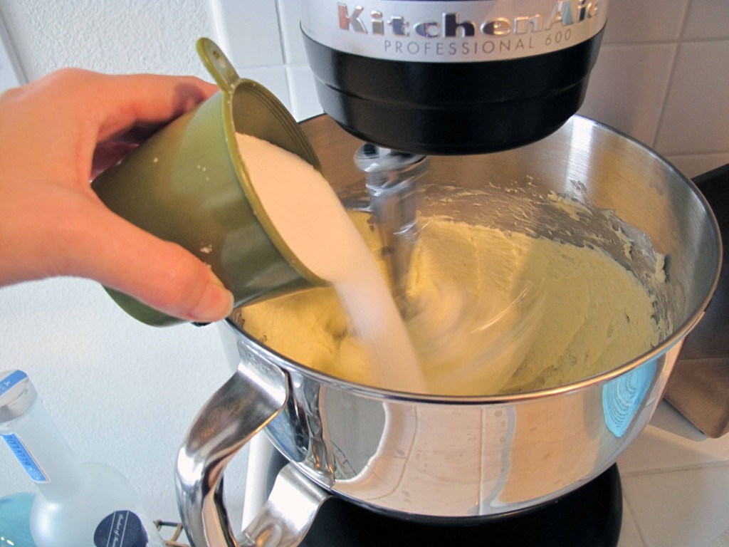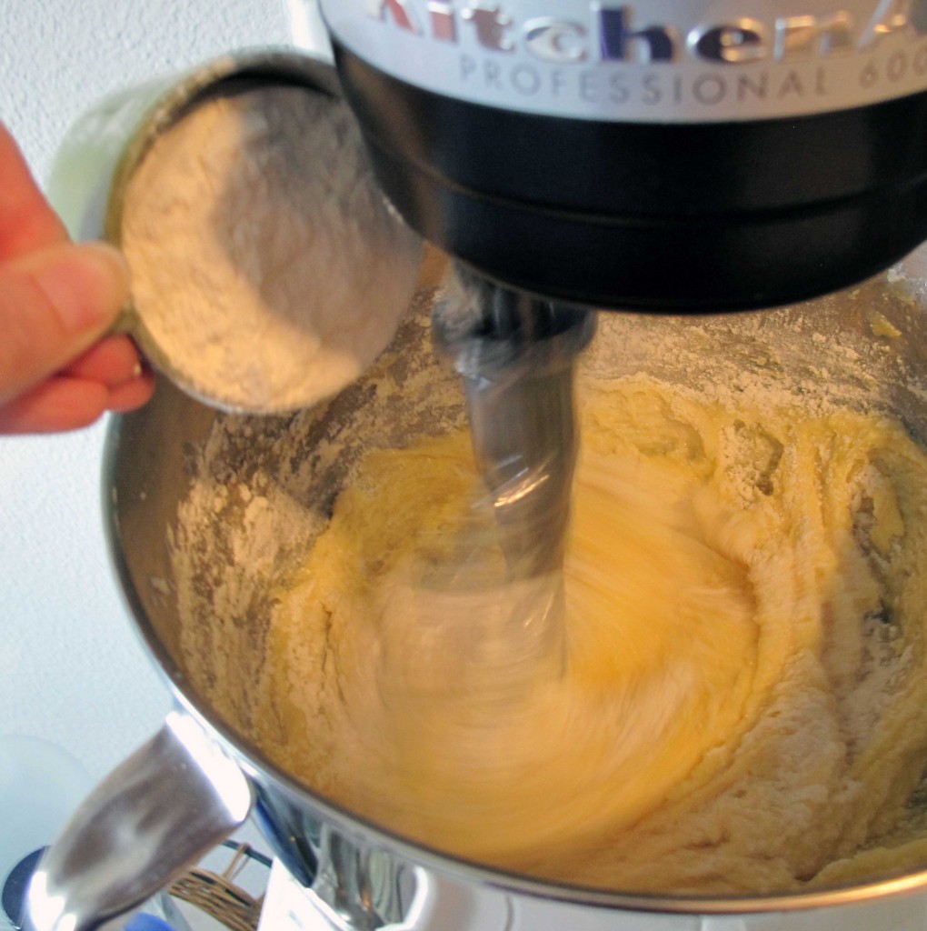 - With mixer running, slowly add dry ingredients to butter mixture, incorporating fully before adding more. I usually add about 1/2 cup of dry ingredients at a time.