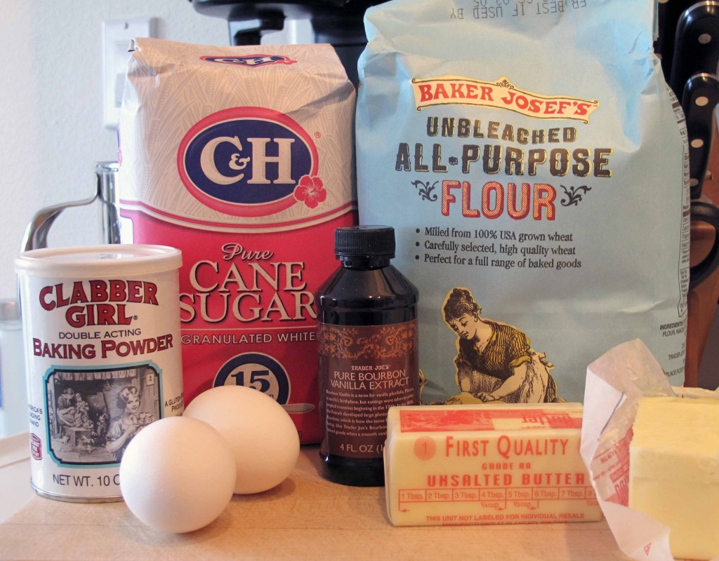 Unsalted Butter, Sugar, Eggs, Vanilla Extract, A.P. Flour, Baking Powder and Salt (not pictured; for Powdered Sugar Icing: Powdered Sugar, Milk and Vanilla.)