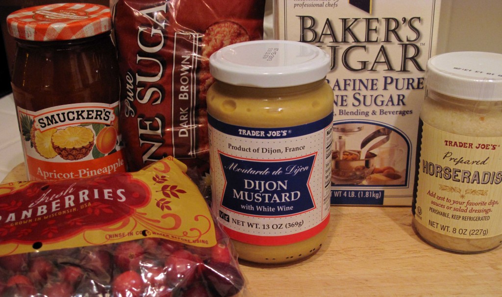 Granulated Sugar, Dark Brown Sugar, Fresh (or Frozen) Cranberries, Pineapple Preserves, Prepared Horseradish, Dijon Mustard and Water (not pictured)